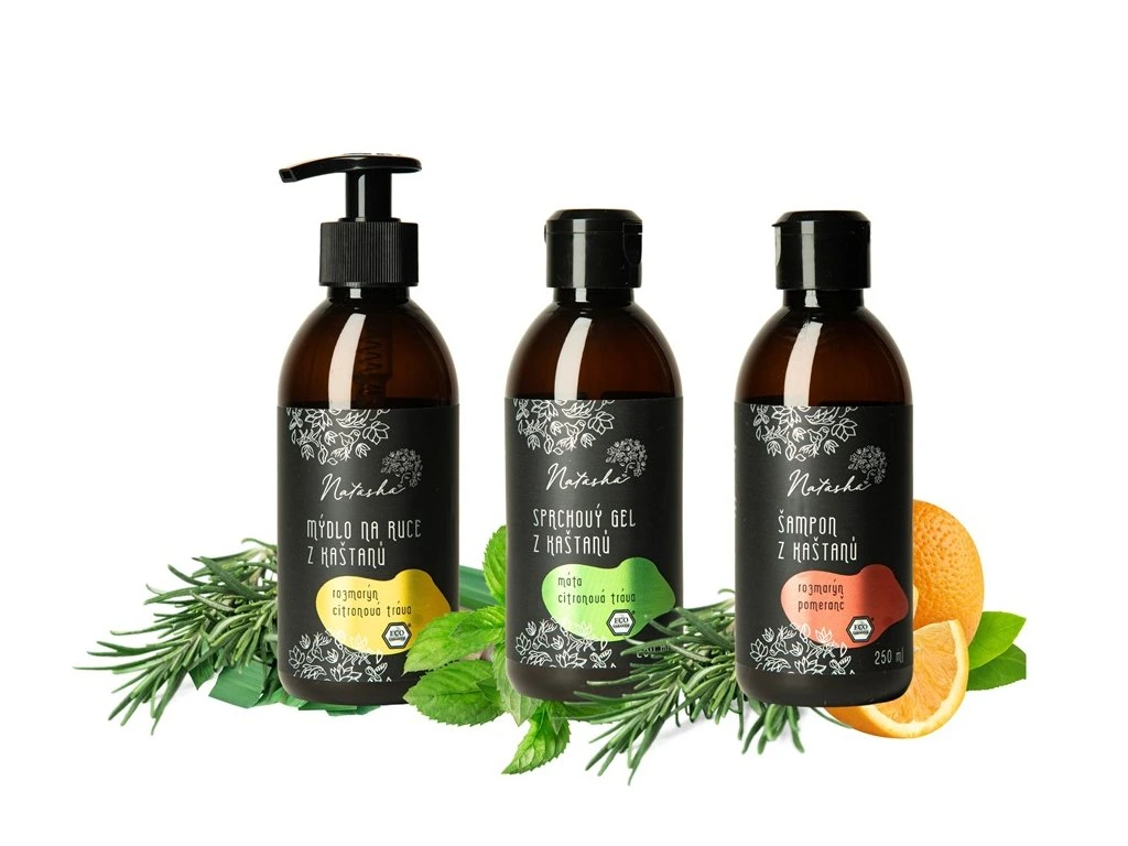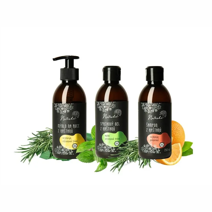 250 ml s pumpičkou Natasha Mýdlo na ruce z kaštanů Rozmarýn a Citrónová tráva, 250 ml Natasha Sprchový gel z kaštanů Máta a Citrónová tráva a 250ml Natasha Šampón z kaštanů Rozmarýn a Pomeranč.